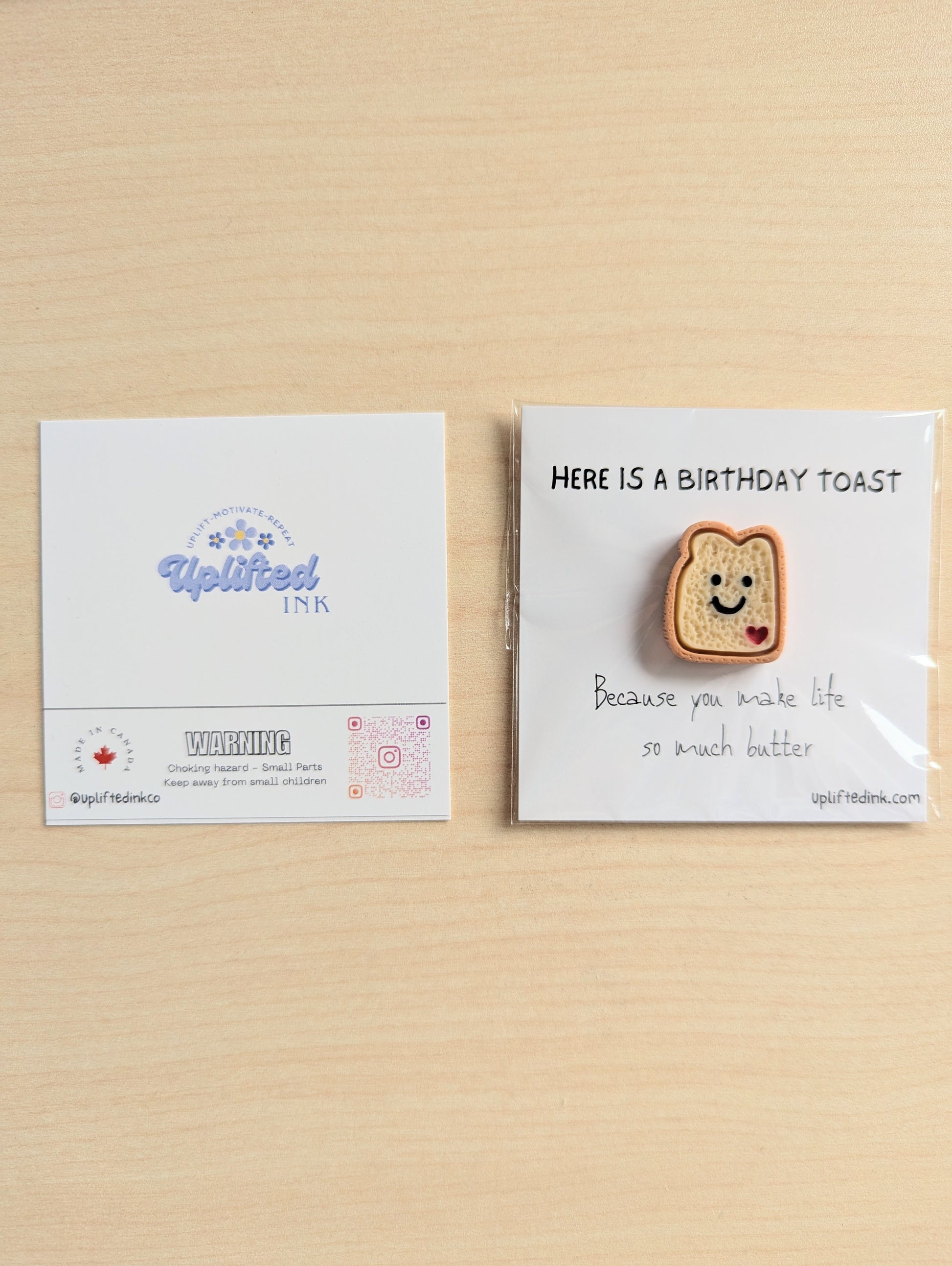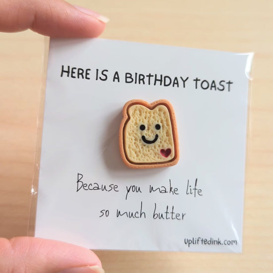 Say happy birthday in the most a-toast-able way possible! This adorable mini birthday card features a tiny smiling piece of toast and the punny message: "Here is a birthday toast, because you make life so much butter." Perfect for food pun lovers, friends who love a good laugh, or anyone who deserves a buttery-smooth birthday wish.